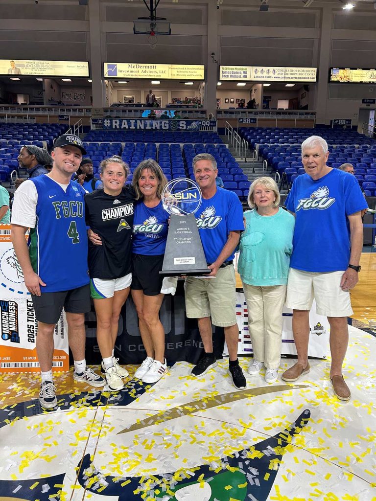 Dolly Cairns cuts down the net after her Florida Gulf Coast University Eagles won the 2025 Atlantic Sun Conference Women’s Basketball Championship.
