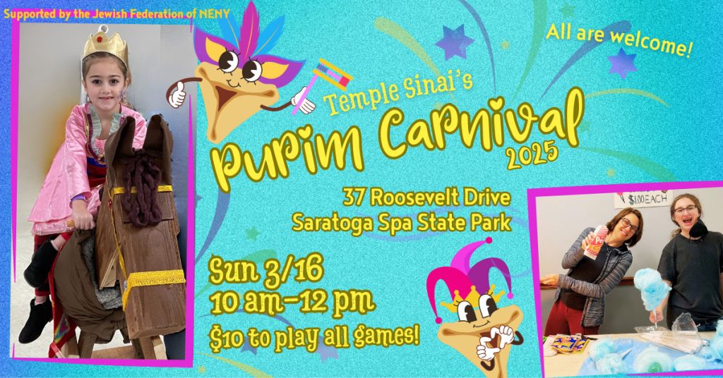 Wristbands for unlimited games and activities are $10 each. Pita & hummus, popcorn, cotton candy, snacks, and beverages will be available for purchase. For further information about Temple Sinai’s Purim Carnival, contact Sylvia Bloom, Temple Sinai’s Director of Education at : educator@saratogasinai.org.