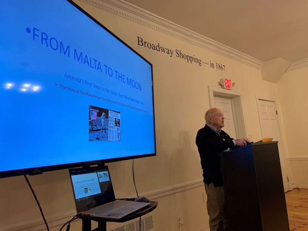 Malta Town Historian Paul Perreault delivers his “From Malta to the Moon” presentation at the Brookside Museum in Ballston Spa on November 12, 2024. Photo by Jonathon Norcross.