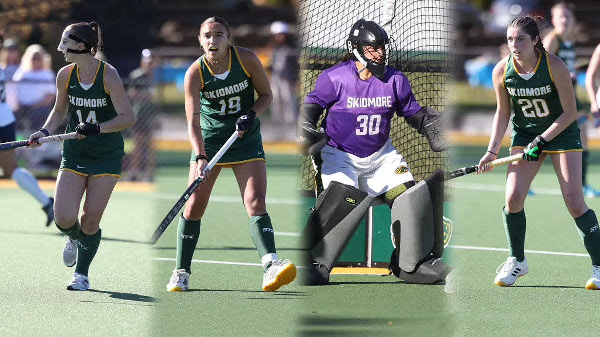Skidmore College field hockey players CC Wetter, Kayla Hassett, Victoria Bodnar, and Erin Ohlenbusch were all named to Liberty League All-Teams. Photos via Skidmore Athletics.