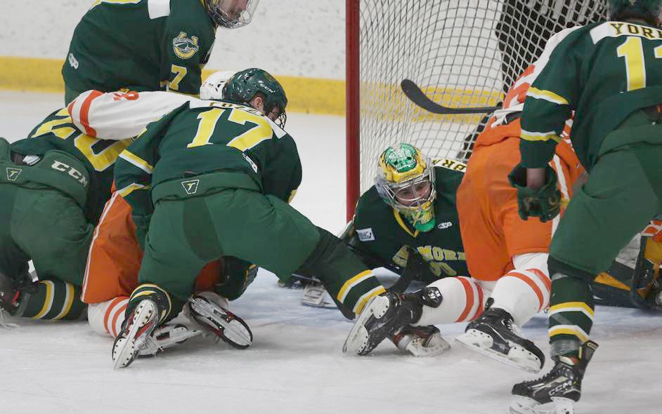 GENEVA — Skidmore College’s hockey team fell short in the New England Hockey Conference (NEHC) championship game last weekend, losing 5-0 to defending champs Hobart College. The Thoroughbreds, who have played in two of the last three NEHC title games, finished 19-7-2 on the season. Goalie Tate Brandon had a career-high 51 saves in the contest.