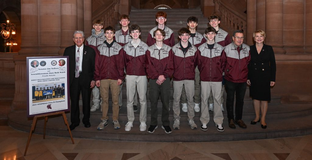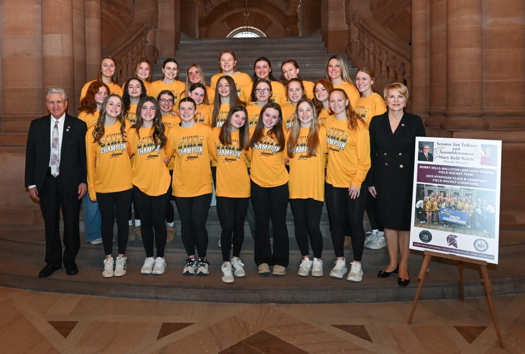 ALBANY — Senator Jim Tedisco (R,C-Ballston Lake) and Assemblywoman Mary Beth Walsh (R,C-Ballston) recently honored the New York State Class B Champion Burnt Hills-Ballston Lake High School field hockey team and boys’ cross-country team by presenting them with legislative resolutions and honoring them at the state Capitol.