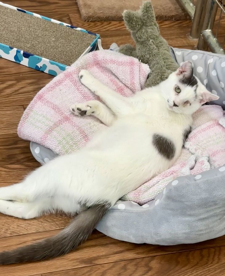 Apple was a stray kitty that showed up at a concerned neighbor’s property. She had a litter of kittens, and they were all placed in homes. She was trapped, spayed and brought to us to socialize and find her forever home. Apple started out shy and unsure of humans, but in just a short amount of time she has accepted pets, treats and love. She will need extra time to adjust to her new environment, but we feel that once she feels safe, she will adore her people. She loves to play when humans are not around and would most likely do best in a quiet home with no dogs or small children. We think, based on how she acts at the center, she would love a kitty friend in the home. She needs a patient person to take a chance on her and give her the time she needs to feel safe and loved. She is estimated to be 1 year old and negative for FIV and FeLV.