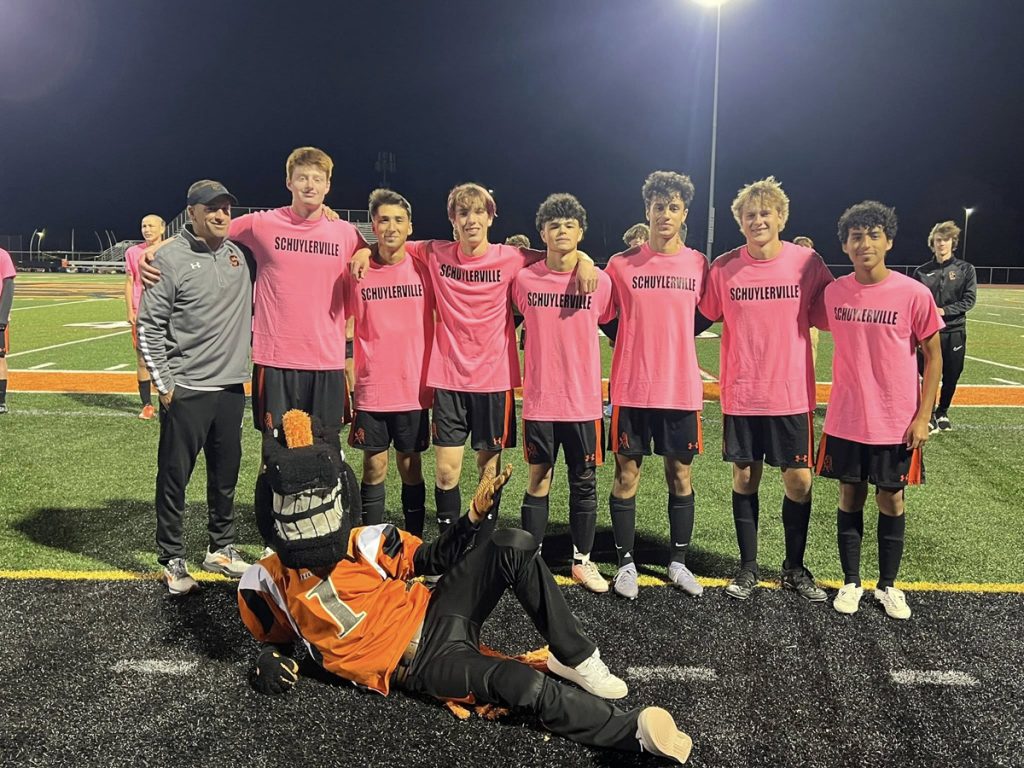 The Schuylerville varsity boys’ soccer team participates in a “pink game” against Glens Falls on Oct. 1. Photo via the Schuylerville Black Horses Varsity Club.