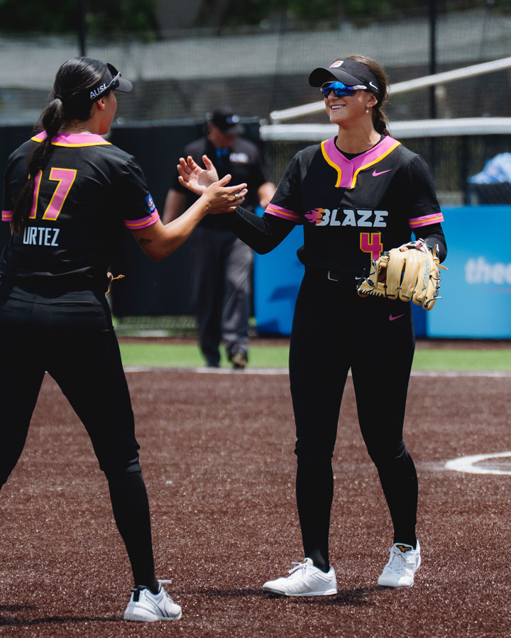 Ana Gold high fives a teammate during an Athletes Unlimited Softball League game. Photo via the AUSL’s Blaze.