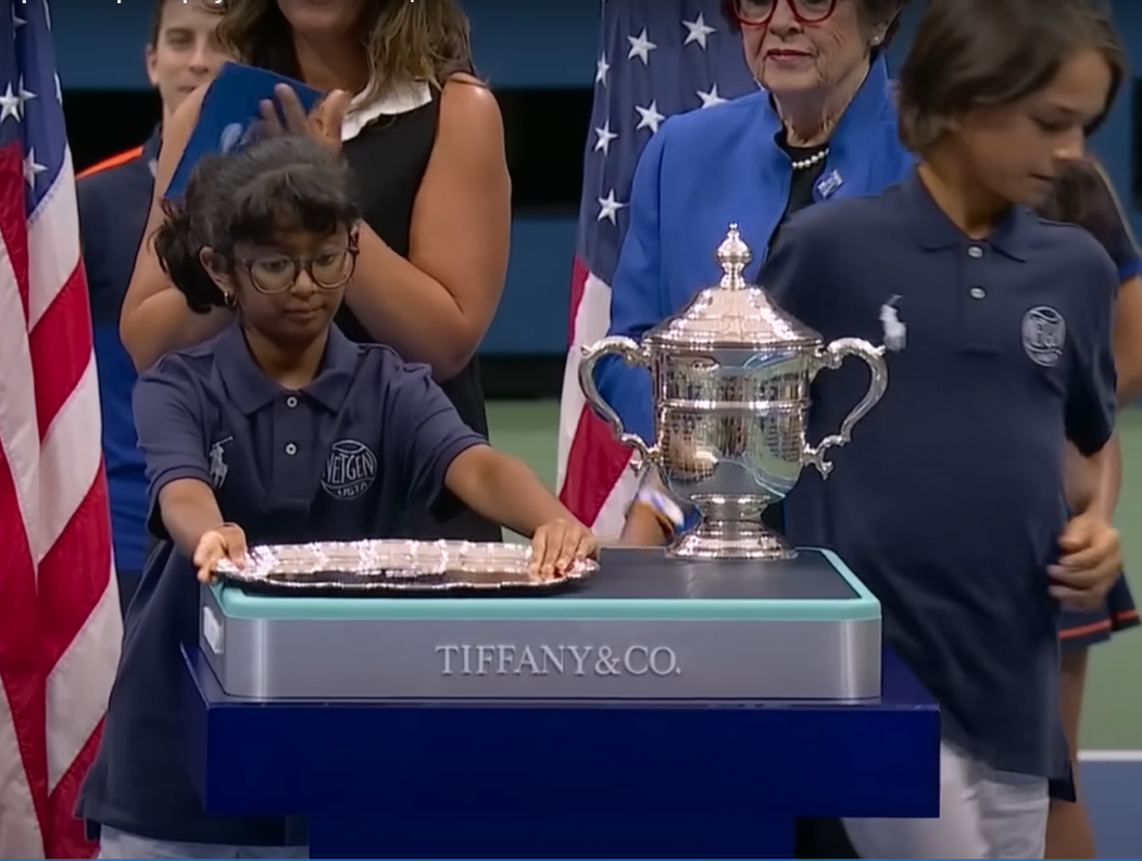 Nayana Shankar from Saratoga Springs helps present trophies to the women’s singles finalists at the US Open Tennis Championships in New York City. Screenshot via the ESPN broadcast.