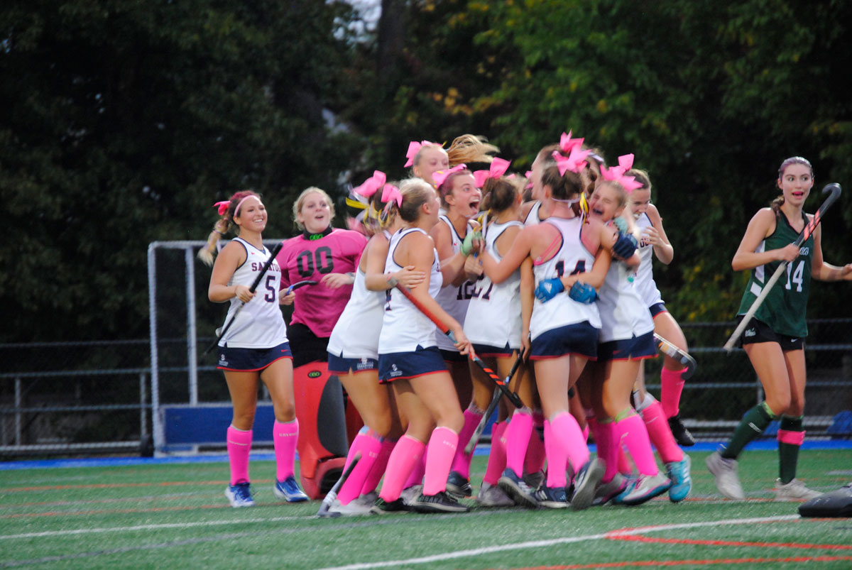 The Saratoga Springs varsity field hockey team celebrates after Claire Frasier’s overtime goal against Shenendehowa on Friday.Photo by Dylan McGlynn.