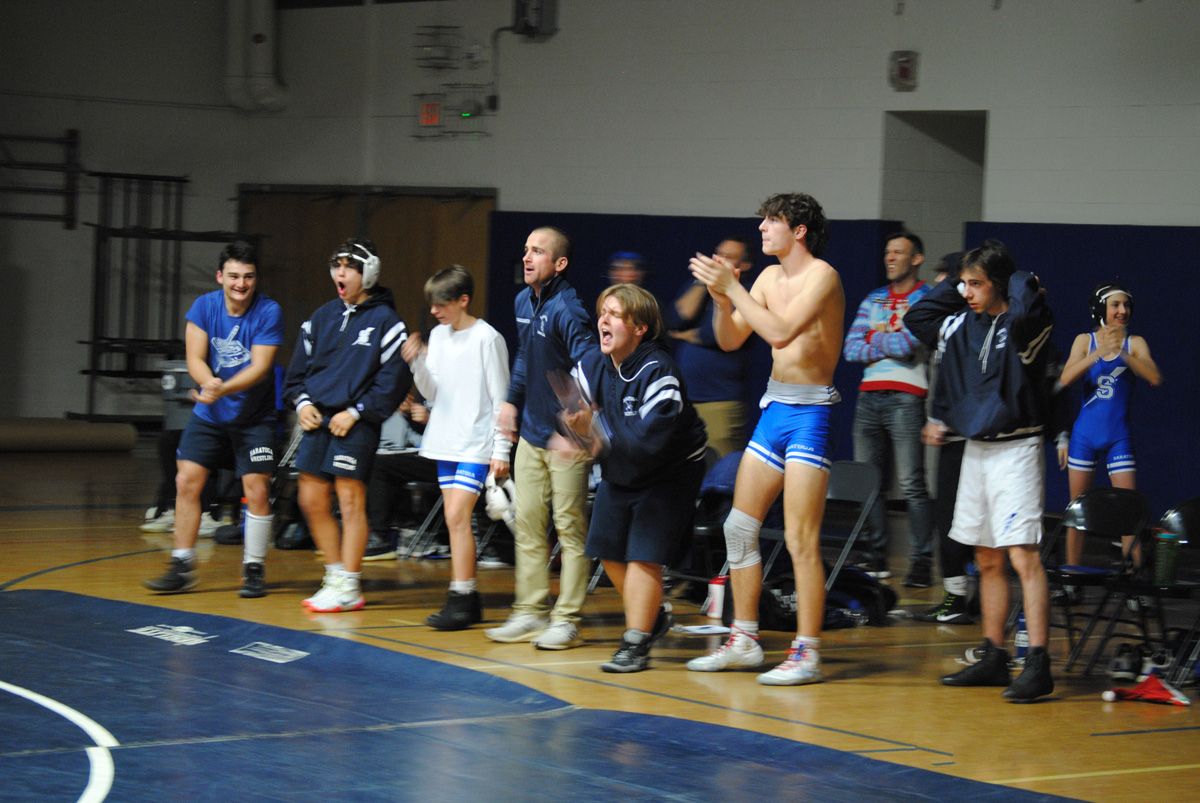 The Saratoga varsity wrestling team celebrates during the Blue Streaks’ 66-4 win over Guilderland on Dec. 21. Photo by Dylan McGlynn.