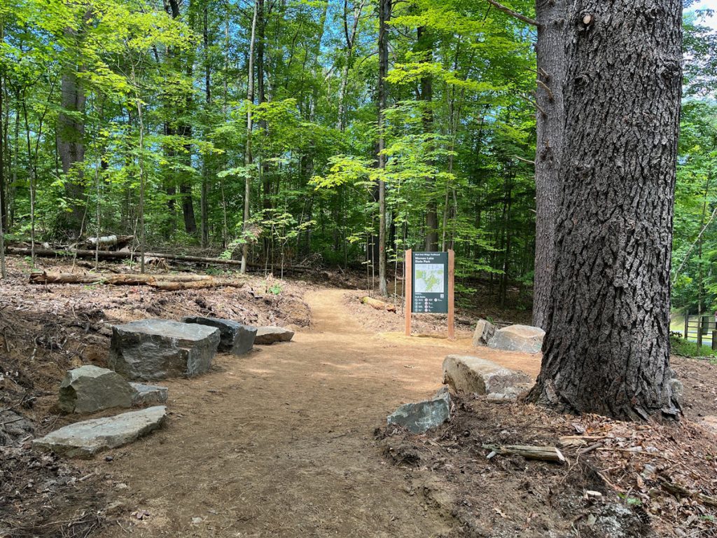 The Red Oak Ridge trailhead at Moreau Lake State Park was updated in 2025 with a new trail map, boulders, and a crosswalk to the parking lot. Photo provided by NYS Parks, Recreation and Historic Preservation.