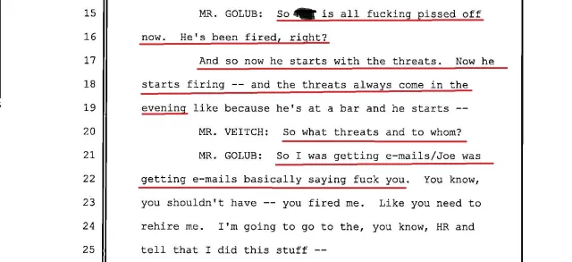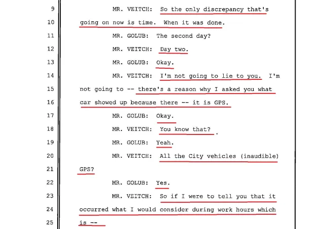 When Veitch asks to see these texts and emails, Golub says he deleted them. When Veitch asks whether the threats are on the city server, Golub says no.
