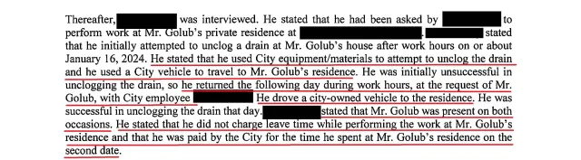 Golub’s use of city employees to work on a residence he owned is thoroughly explored in this earlier post. As a reminder, below are excerpts from the city’s Human Resources Department that found Golub guilty of improper use of city employees.