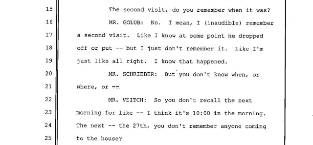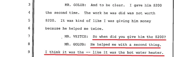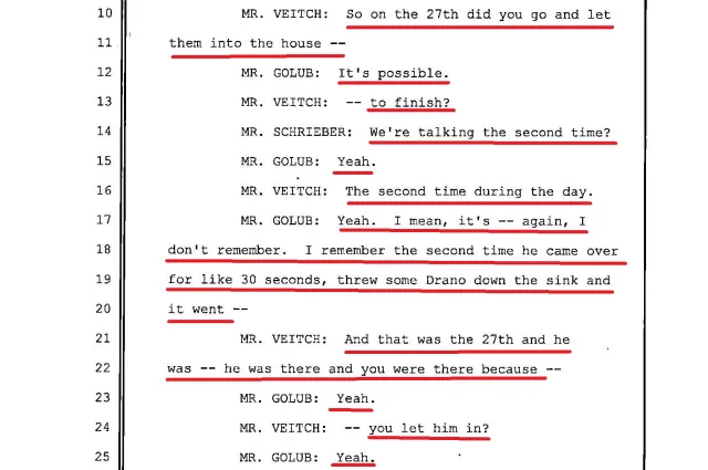 As these excerpts document, unlike the plumber, Jason Golub had a lot of trouble remembering the events, particularly of the second day. In this first excerpt, he doesn’t remember that the plumber came on the second day, that Golub let him in, that he came a second time for thirty minutes, accompanied by another employee, and that Golub let him in.