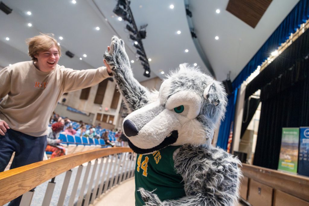 SUNY Adirondack Timberwolf mascot Eddy Rondack high-fives Saratoga Springs High School students at an event last month. Photo via the Saratoga Springs City School District.