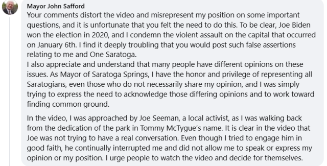 Seeman asked Safford if he thought that Trump lost the election in 2020 or whether he (meaning Trump) was cheated. When Safford attempts to answer, Seeman interrupts him, insisting it is a yes or no question. Safford offers that “a lot of people see just one side. A lot of people see another side. What we need to do is find a way to talk in the middle. Right now we are so divided. That’s what we are trying to do here in the city with One Saratoga.” As Safford tries to explain what he means, Seeman talks over him, making a discussion impossible. Safford then realizes that this is not a serious attempt at dialogue and excuses himself. The entire dialogue, which lasts one minute and forty-nine seconds, is included at the bottom of this post.