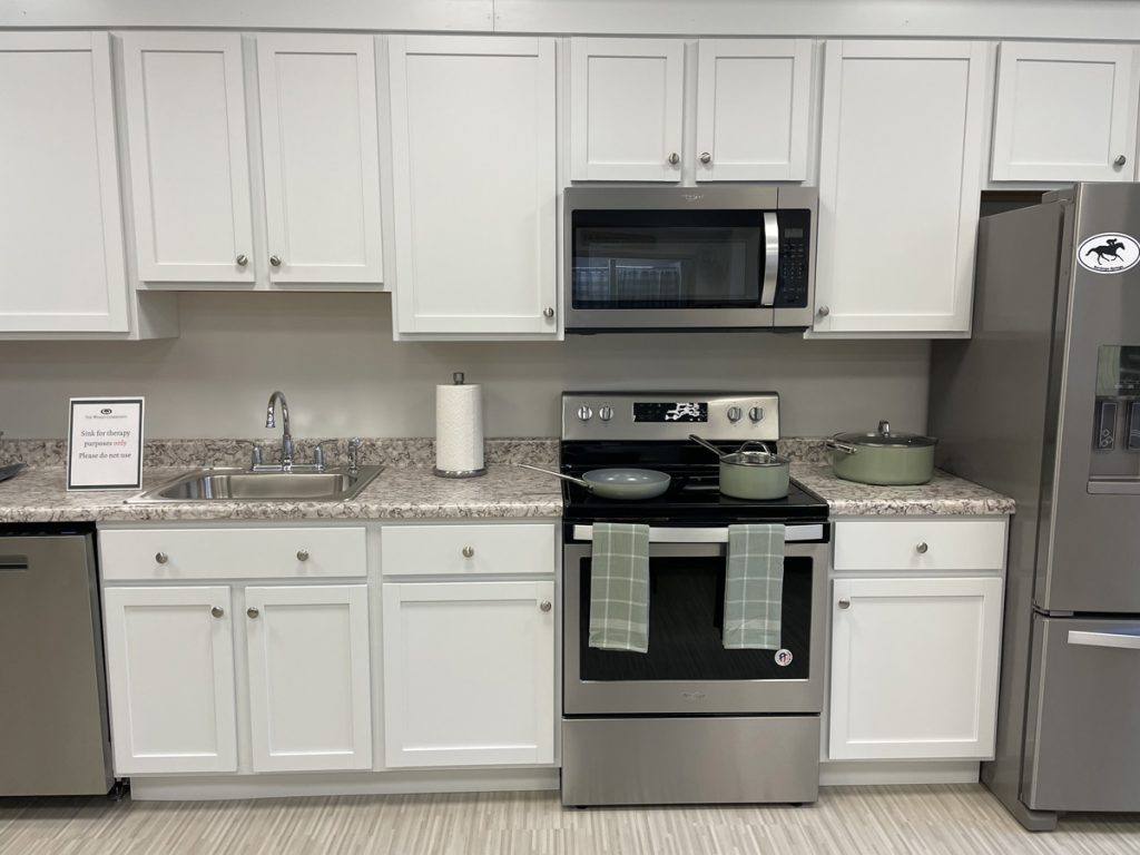 The upgraded therapy room offers a home-like setting with a functional kitchen, bedroom and bathroom. Clients work with staff and practice hands-on, daily living activities to regain their strength and independence. The goal of learning how to safely move throughout their home space is to prevent falls and re-hospitalization.